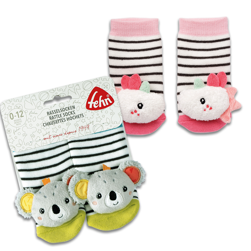 Diese Activity-Babysöckchen mit niedlichen Koalas oder Einhörnern fördern spielerisch Greifreflex, Hörsinn und Motorik. Beim Strampeln erklingen sanfte Rasselgeräusche – das macht neugierig und hält warm zugleich. Ideal für Babys von 0 bis 12 Monaten. Pflegeleicht bei 30 °C waschbar. Ein liebevolles Spielzeug und praktisches Accessoire in einem. Größe: 12 cm
