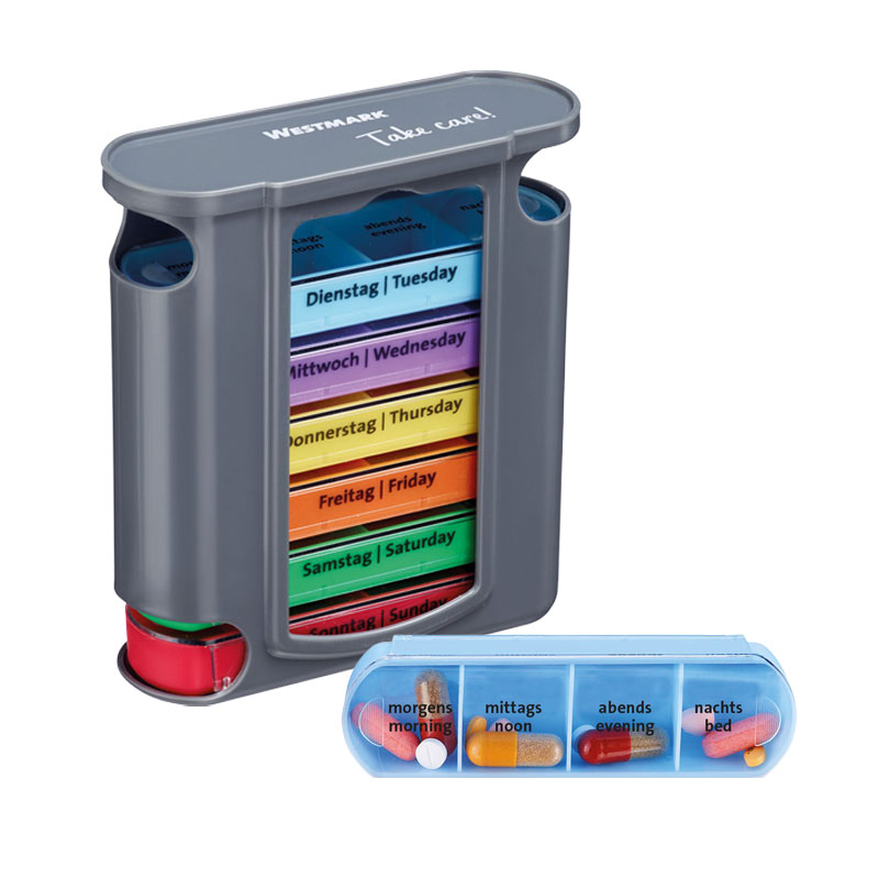 Die praktische Tablettenbox organisiert Medikamente oder Nahrungsergänzungsmittel für sieben Tage. Sie besteht aus sieben einzelnen Tagesboxen, die jeweils in vier Fächer unterteilt sind: morgens, mittags, abends, nachts. Die Tagesboxen lassen sich leicht entnehmen und wieder einsetzen. Die ideale Vorbereitung für Reisen oder für die lieben Großeltern. Kompakt, BPA-frei und zweisprachig (DE/EN) beschriftet, sorgt sie für Sicherheit und Komfort im Alltag.