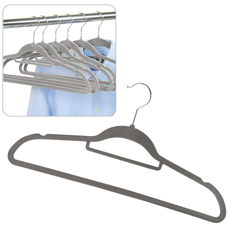 Die sechs stabilen Kunststoffbügel mit samtweicher Anti-Rutsch-Beflockung halten Kleidung sicher auf dem Bügel. Die Bügel sind mit Hosensteg, zwei Rockkerben sowie Tuch- und Krawattenhalter für die perfekte Ordnung im Schrank ausgestattet.