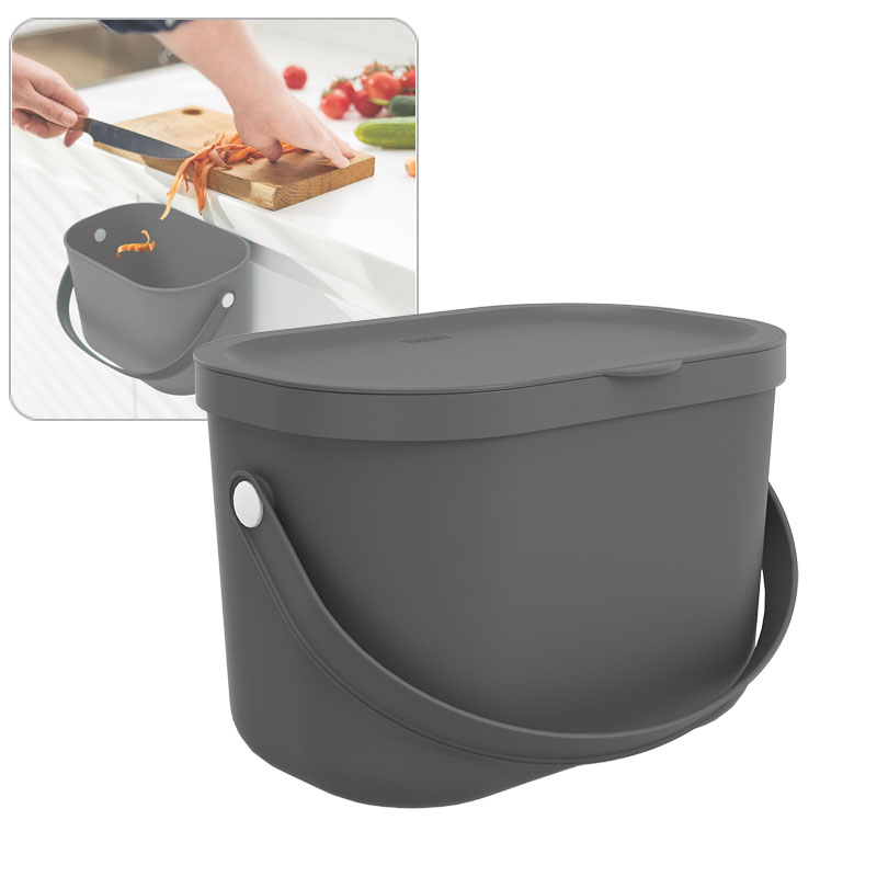 Der kompakte Bioabfallbehälter sammelt Küchenabfälle, Kaffeekapseln oder Spültabs sauber und bequem. Der Deckel kann in geöffneter Position fixiert oder sogar abgenommen werden – für eine großzügige Öffnung. Dank integriertem Griff gelingt das Entsorgen mühelos. Ob auf der Arbeitsfläche oder aufgehängt passt er in jede Küche. Aus 94 % recyceltem Material gefertigt, verbindet er Design mit Umweltbewusstsein.